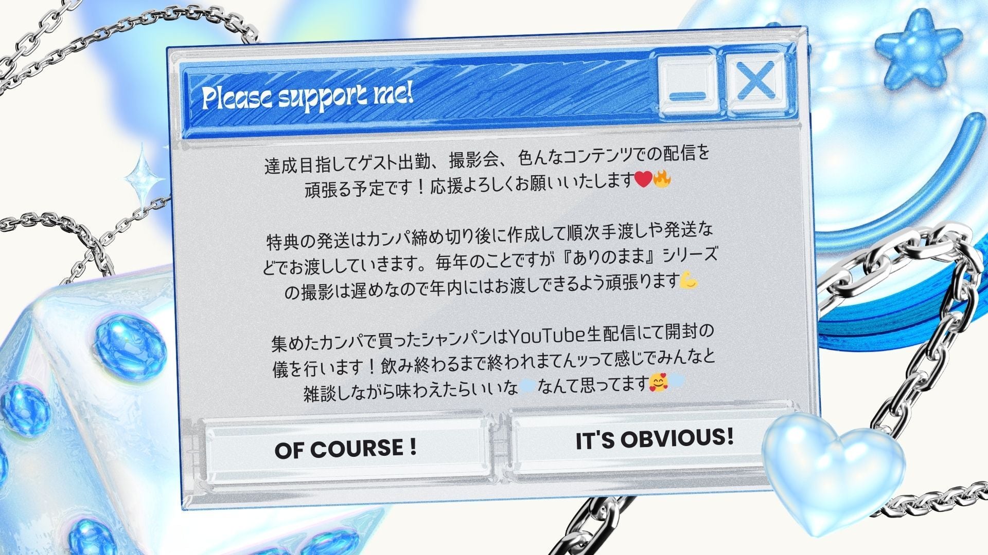 集めたカンパで買ったシャンパンはYouTube生配信にて開封の儀を行います!飲み終わるまで終われまてんッって感じでみんなと雑談しながら味わえたらいいな…なんて思ってます!